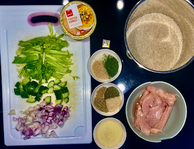 Add all the ingredients for the chicken into a bowl and stir so the chicken is coated and set aside for 10-15 minutes to marinade. Prepare your other ingredients during this time